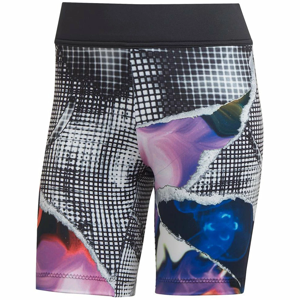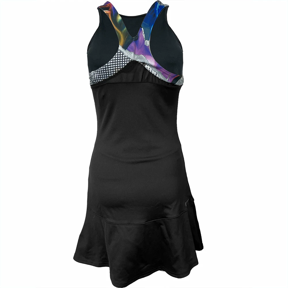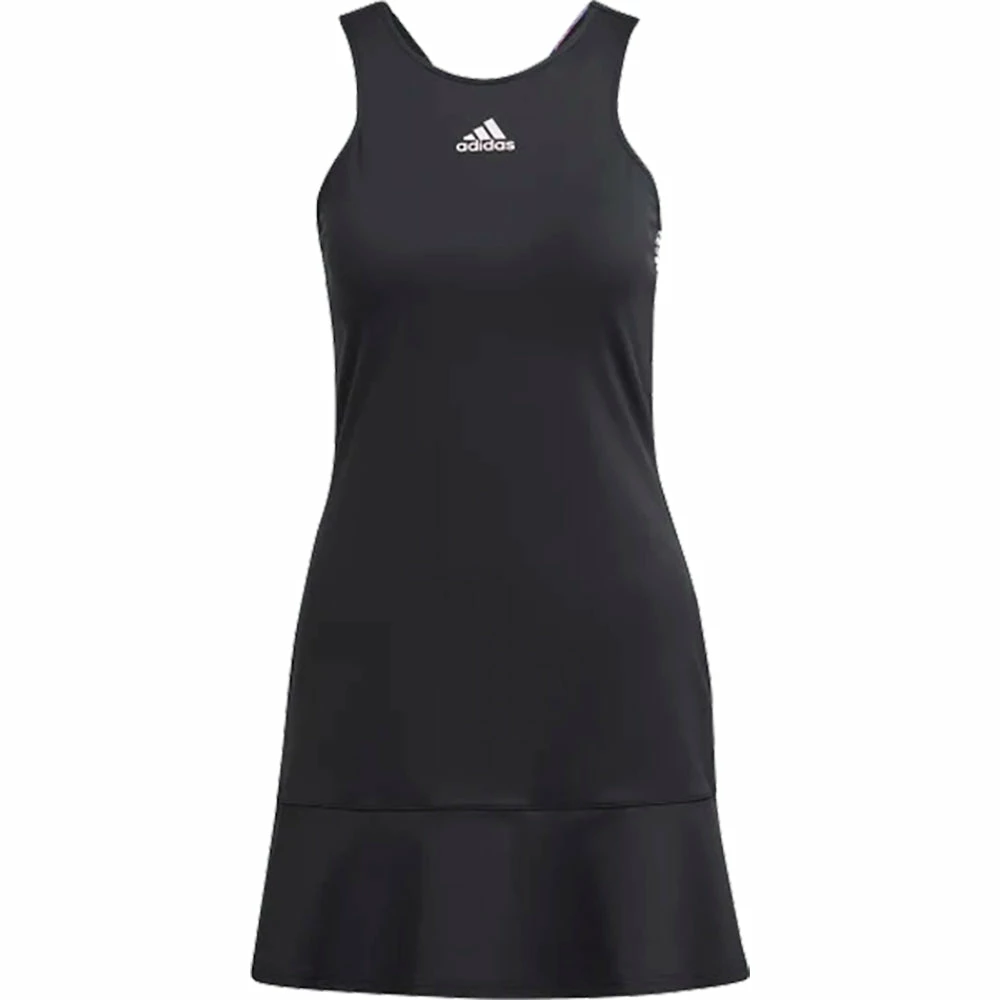 Highlight the issue of plastic waste in the run-up to North America’s biggest tournament. Bold, ocean-inspired graphics draw the eye to the Y-strap and inner tights of this adidas tennis dress. Created from super-soft fabric, it includes moisture-wicking AEROREADY for no-distraction play. Behind those vibrant colors, that strap is ergonomically designed to give you room to play your natural game. Slim fit. Round neck with Y-back. Fabric: 85% recycled polyester, 15% elastane interlock. Colour Shown: Black / Clear Pink.