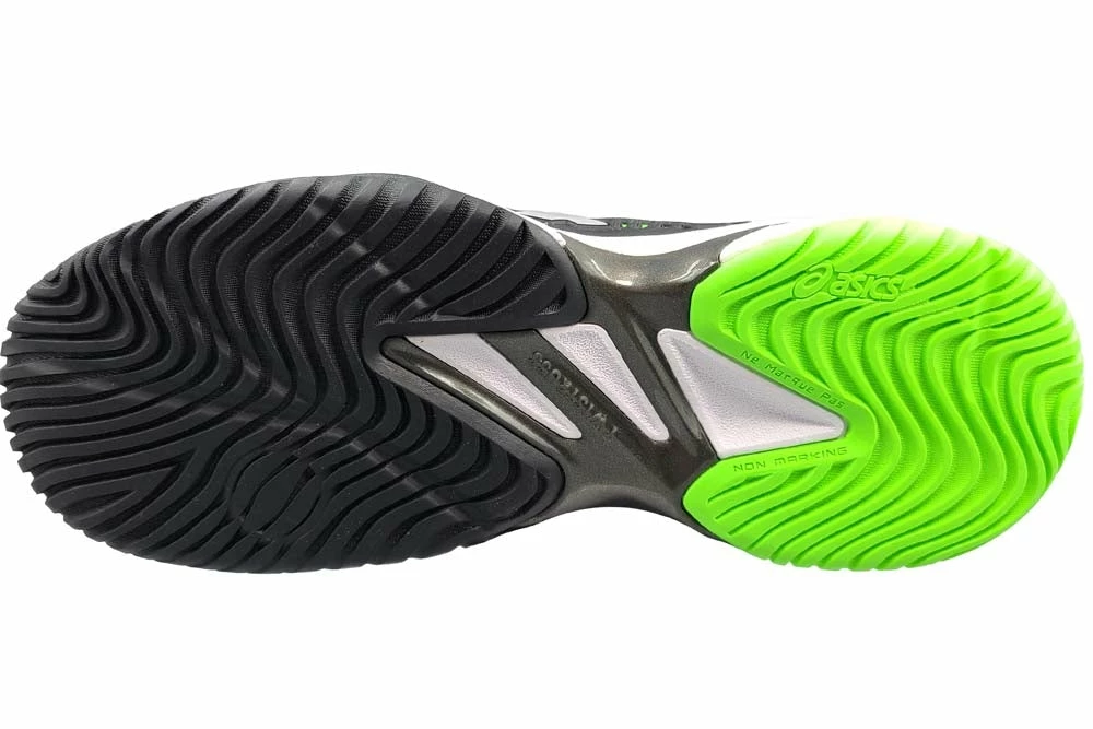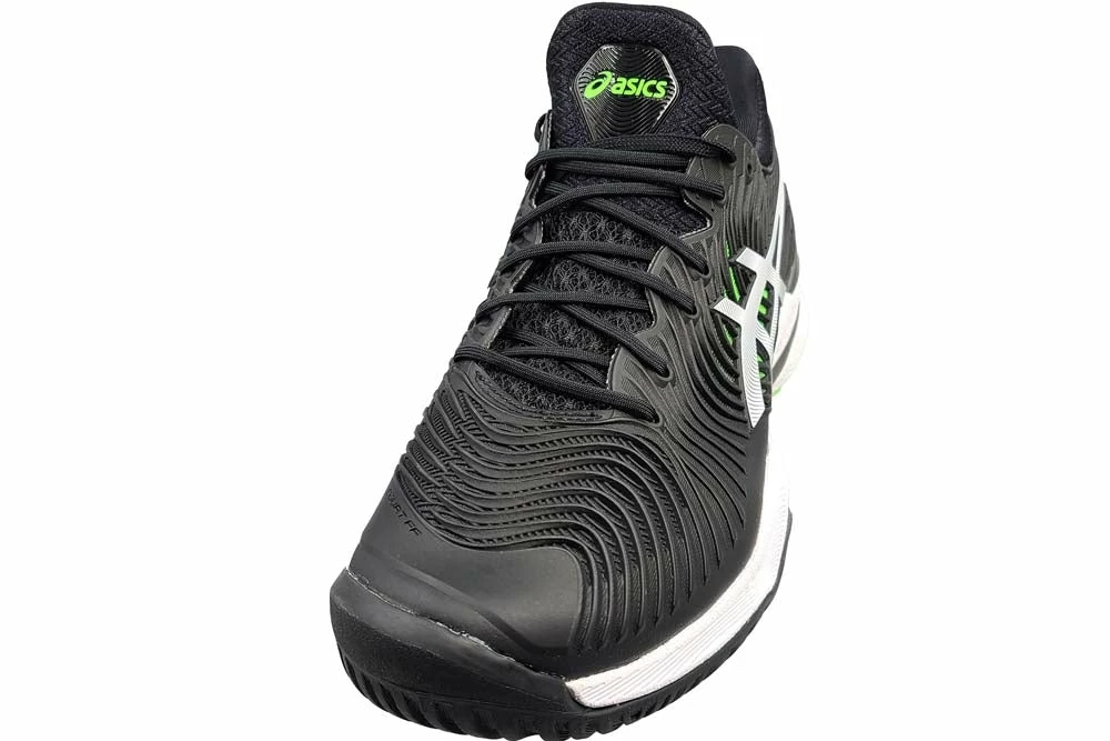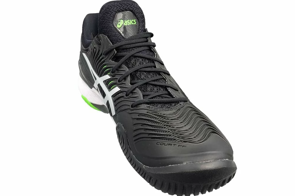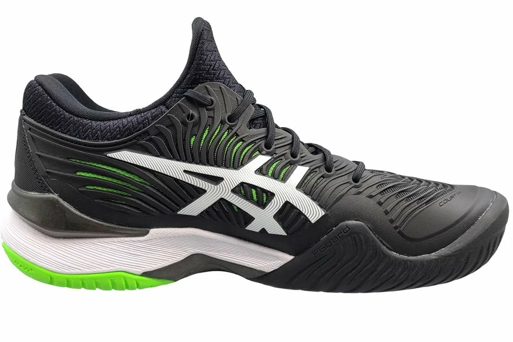 Novak Djokovic’s shoe of choice ! Play faster than ever before with the COURT FF® 2 men’s tennis shoe from ASICS. Featuring FLYTEFOAM® midsole technology, the shoe also boasts Rearfoot and Forefoot GEL® technology for an improved toe spring and cushioned full ground contact which will make you unstoppable on the court. Ideal for court players with a need for speed and a longing for luxury, the shoe’s MONO-SOCK® fit system and TRUSSTIC SYSTEM® technology gives your foot high level comfort and stability as you look to finish off the game. The COURT FF® 2 tennis shoe is designed to help you perform at your best. Hit the court with confidence in this premium tennis shoe. Colour Shown: Black / Green.