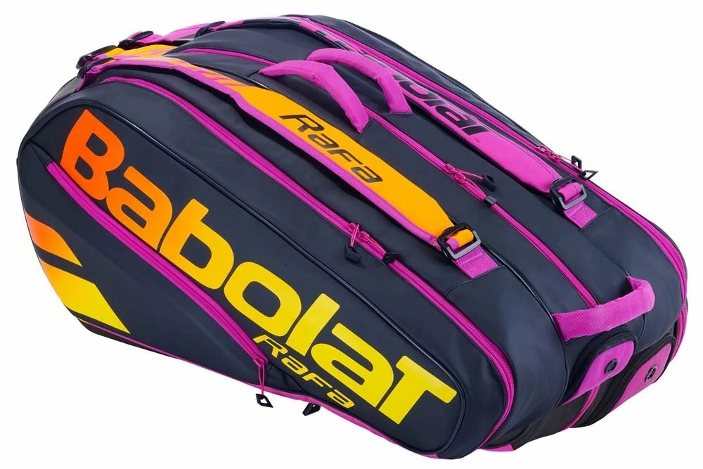 TOP OF THE LINE TENNIS BAG, USED BY RAFAEL NADAL! Stiff shell structure with a carbon-like effect to protect racquets. 2 insulated racquet compatments to maintain string tension settings. Convenient central comparment for storing clothes. Removable shoe pouch. Large side pocket with integrated organizer for tennis accessories and personal items. Dual carrying strap with ergonomic shoulder pads for greater comfort. Logo window to personalize your bag (visit www.mybabolatbag.com to create your own unique tag).