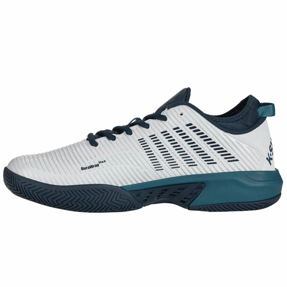 Building on the success of the most important tennis franchise in company history, Hypercourt, K-Swiss introduces a new hero model to the family targeting a young, competitive, aggressive player. The Hypercourt Supreme incorporates new technologies including Surge 7.0 for maximum energy return and Dragguard 7.0, elevating outsole durability. Additionally, a comfortable upper bootie construction ensures a secure fit. Ideal for hard court or clay court playing surfaces. Colour Shown: White / Reflecting Pond / Colonial Blue.