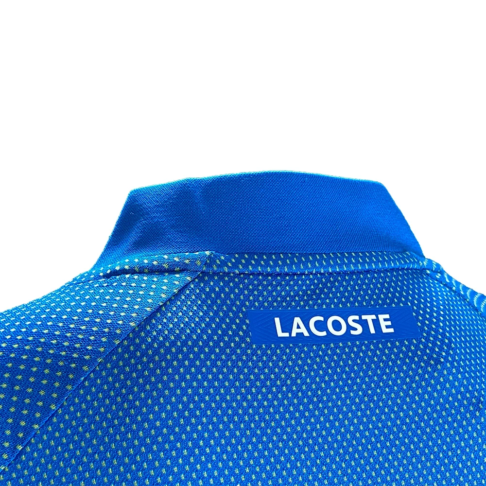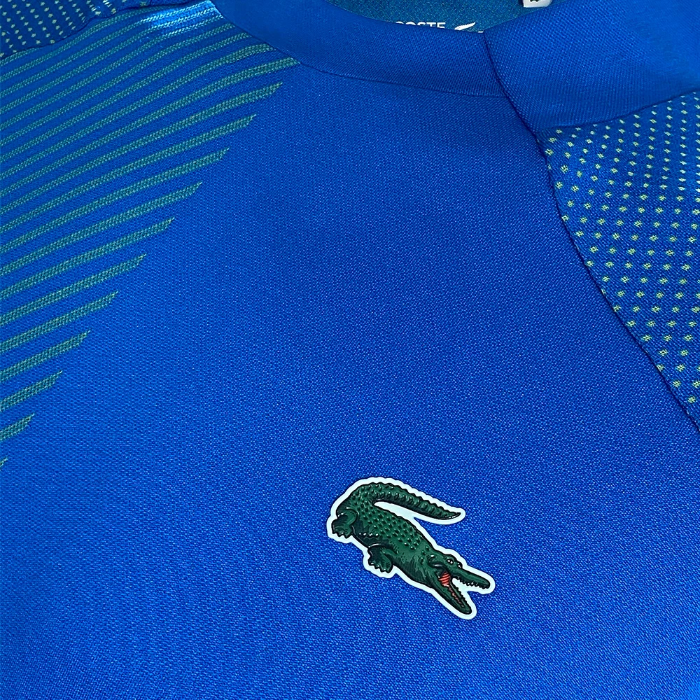 An uncompromising, high-tech polo. Crocodile signature precision and performance both on and off the court. Daniil Medvedev’s choice. Slim fit, adjusted cut: Made for movement. Incrusted collar/encrusted collar: Inspired by the Lacoste archives. Raglan sleeves: For stronger serves. Rigid crocodile sewn on: Lacoste, reinvented. Fabric: Polyester 85%, Polyamide 15%. Collar: Polyester 79%, Polyamide 21%. Colour Shown: Blue / Green.
