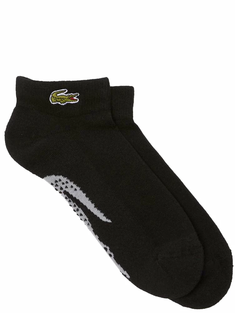 Oversized contrasting brand lettering brings a signature look to these short, solid socks. Crafted in soft, resistant, stretchy cotton jersey, they feature ribbed ankles and a small embroidered green crocodile. Slip them on for a comfortable session. Stretch cotton blend jersey. Ribbed ankle support. Contrast Lacoste branding under foot. Embroidered green crocodile on ankle. Fabric: Cotton (92%), Polyamide (7%), Elastane (1%). Colour Shown: Black / Grey.