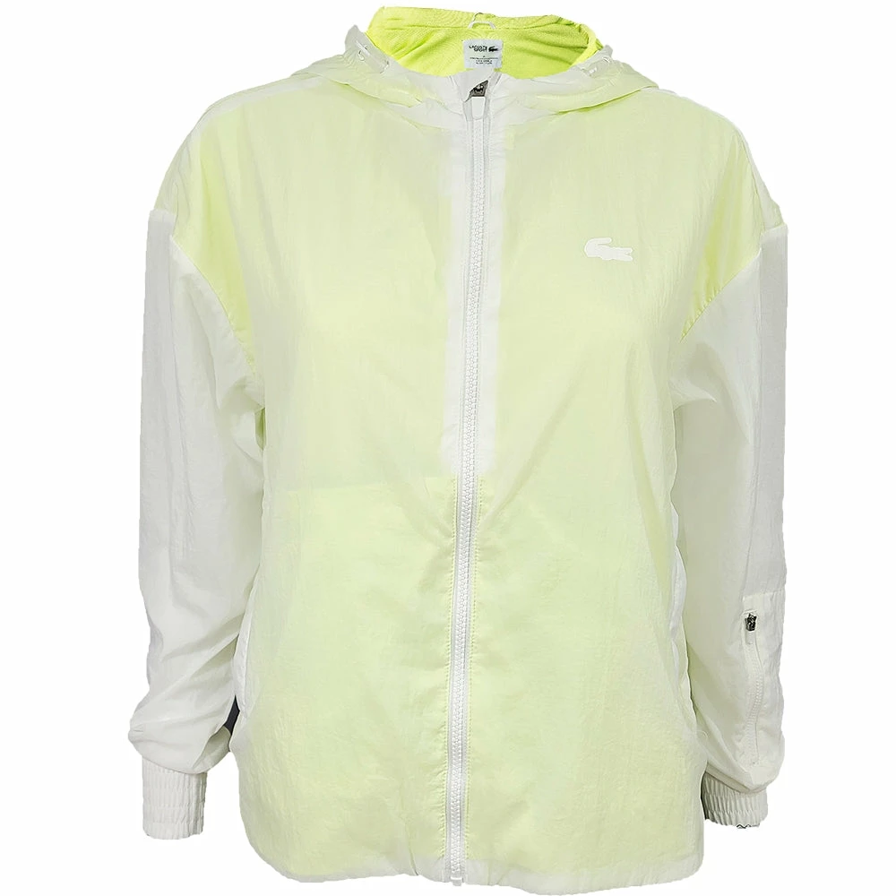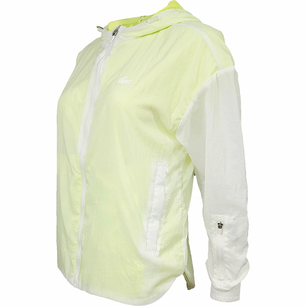 Keep stylish as you warm up or cool down at training with a Lacoste Sport jacket. With a side zip fastening for easier movement, an adjustable hood and practical pockets, this lightweight nylon piece has what youβre looking for. A breathable contrasting mesh interior completes the model, built for performance with a crisp design. Drawstring hood and zip collar. Recycled lightweight nylon and contrast mesh interior. Front pockets and zip pocket on sleeve with interior ring for keys. Zippered fastening, asymmetrical cut with round back and smock wristbands. Tone-on-tone crocodile transfer on chest. Fabric: Main fabric: Polyamide (100%) / Lining: Polyester (100%). Colour Shown: White/Yellow.