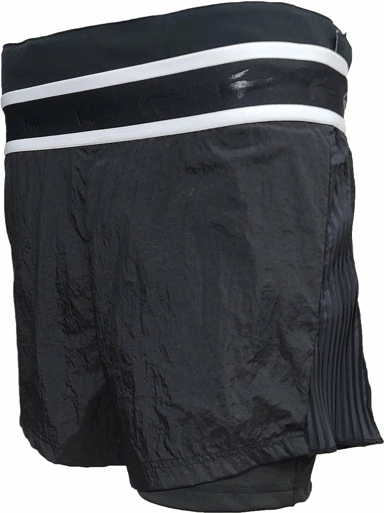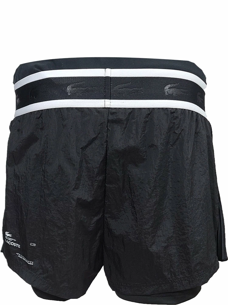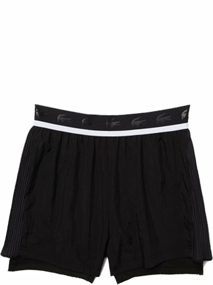 Fashion meets technical crafting in the form of this feminine pair of Lacoste Sport shorts. Crafted in lightweight recycled nylon, they are equipped with built-in compression shorty in a contrasting fabric. A elastic waist and side pleats ensure a great freedom of movement. Truly essential for your next match, with well-designed accents. Tone-on-tone crocodile transfer at bottom of garment. Fabric: Polyamide (100%) / Body: Polyamide (100%) / Integrated shorts: Polyester (77%), Elastane (23%) / Belt outer: Polyester (78%), Polyamide (12%), Elastane (10%) / Side yoke: Polyester (100%). Colour Shown: Black / White.
