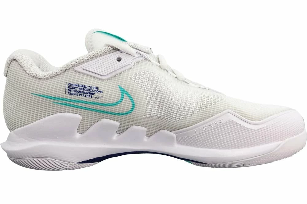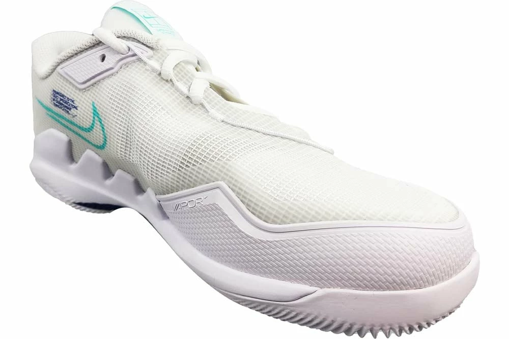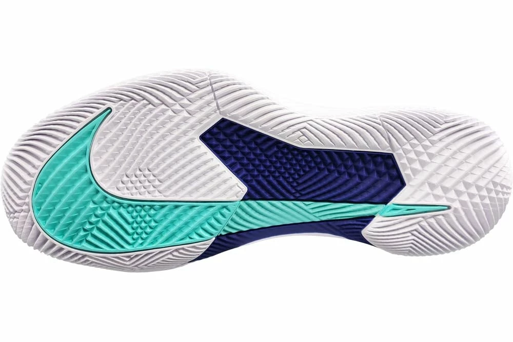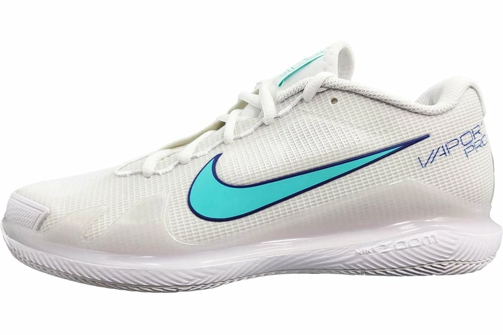 The NikeCourt Air Zoom Vapor Pro takes everything you love about the NikeCourt Air Zoom Vapor X and makes it lighter and more supportive. Players in search of their new favorite shoe might find it in the Air Zoom Vapor Pro! Nike has taken the best features of the shoe it replaces and adds in some new technology for the speediest Vapor yet! The upper has been redesigned and offers dual layers of support with a stretchy inner sleeve and a layer of durable mesh to assist in support and breathability. The asymmetrical lacing system has been strategically added for even more support when moving laterally. Players who have worn the Vapor X will recognize the midsole and outsole as a Zoom Air unit in the heel offers responsive cushioning underfoot while the generative outsole pattern enhances explosive directional changes. While not the most durable shoe in Nike’s line up, durability has been updated with added tread in high-wear zones. Colour Shown: White / Dynamic Turquoise-Light Bone.