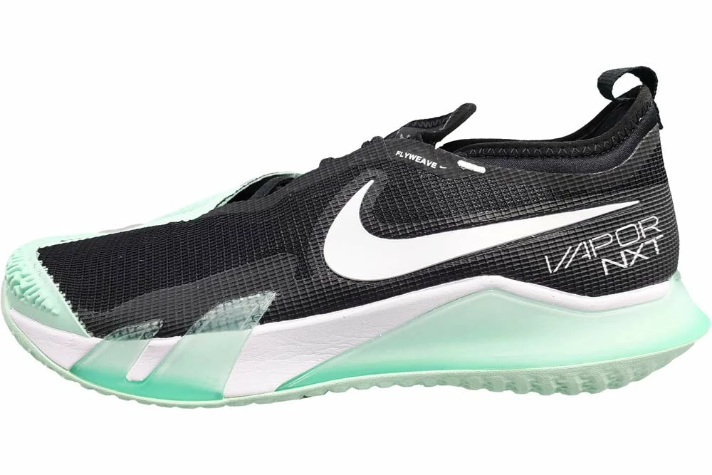Meet the next generation of tennis performance. Built using years of athlete data, the NikeCourt React Vapor NXT brings top-notch traction and an innovative cushioning system, so you can play at your best during your fastest and fiercest matches. Similar to the Vapor Cage 4, it utilizes durable rubber and plastic in high-wear areas, and the laces on the medial side are shielded. There is also a sock-like fit with attached tongue, and a new herringbone outsole. Designed for wear on hard court surfaces. Removable insole. Heel pull tab. Colour Shown: Black / White-Mint Foam.