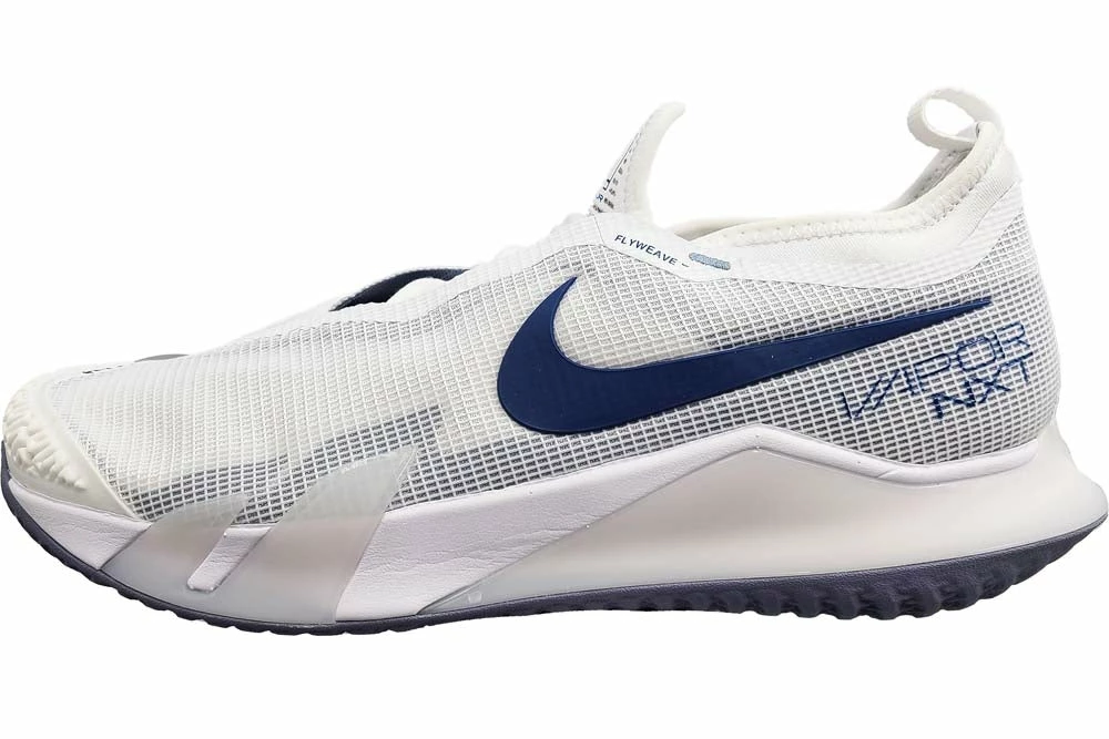 Meet the next generation of tennis performance. Built using years of athlete data, the NikeCourt React Vapor NXT brings top-notch traction and an innovative cushioning system, so you can play at your best during your fastest and fiercest matches. Similar to the Vapor Cage 4, it utilizes durable rubber and plastic in high-wear areas, and the laces on the medial side are shielded. There is also a sock-like fit with attached tongue, and a new herringbone outsole. Designed for wear on hard court surfaces. Removable insole. Heel pull tab. Colour Shown: White / Mystic Navy-Ashen Slate-Volt.
