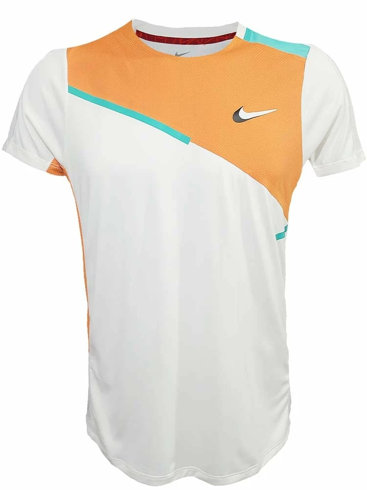 Incredibly stretchy and breathable, the NikeCourt Dri-FIT Slam Top wicks sweat so you can stay dry and comfortable when your match heats up. Paying homage to Nike’s rich history, the asymmetrical taping on the front is inspired by the iconic Windrunner. Slim fit for a tailored feel. Fabric: Body: 100% polyester. Mesh: 93% polyester/7% elastane. Colour Shown: White/Hot Curry/Washed Teal/White.