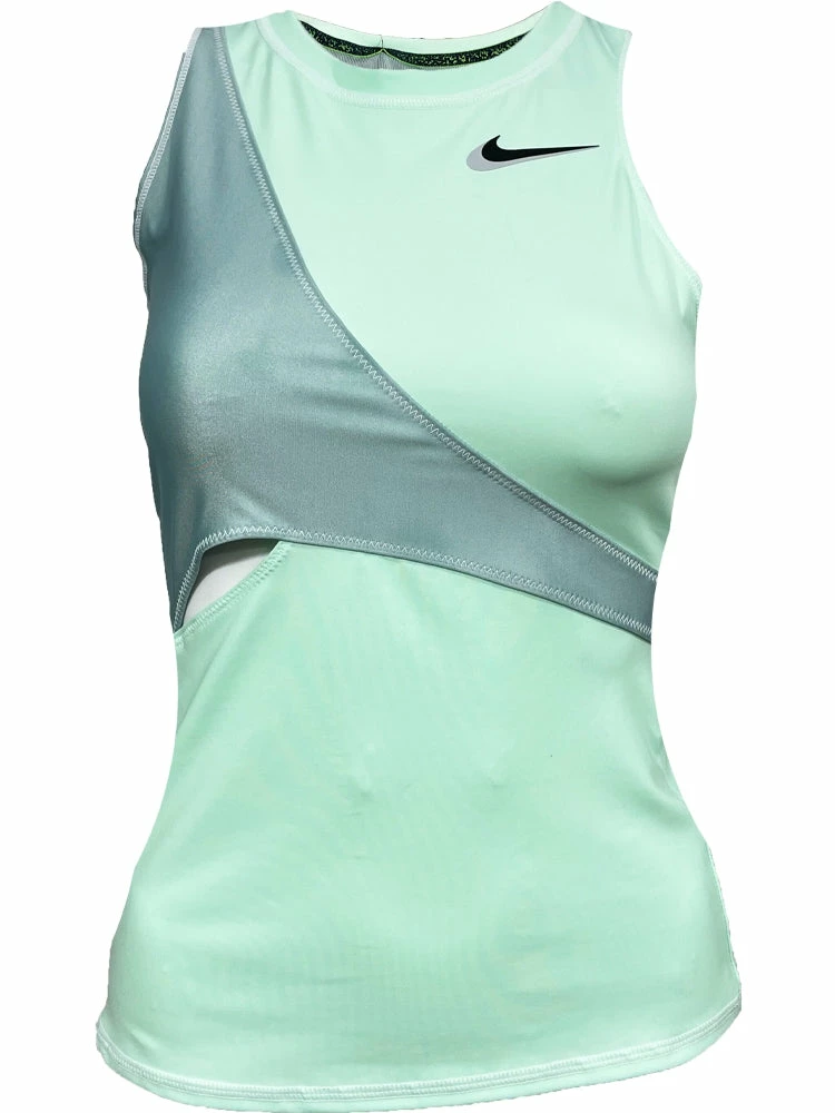 With its flowing, asymmetrical lines and stretchy, body-hugging fabric, the NikeCourt Dri-FIT Slam Tank helps you bring a sense of modern elegance to the court. And when your match gets going, cutouts in the front and back enhance airflow to keep you cool. Racerback. Fabric: Body: 83% polyester/17% elastane. Panel: 74% polyester/26% elastane. Colour Shown: Mint Foam/Ocean Cube/Black.