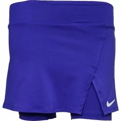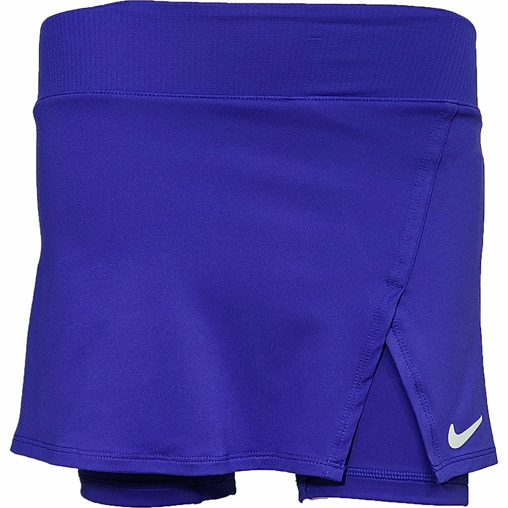 Crafted with lightweight, stretchy fabric, the NikeCourt Victory Skirt gives you the comfort you need to play at your best. A side slit gives you extra room to move while you run and slide, while also providing easy access to any tennis balls you stash under the inner shorts. This product is made from at least 75% recycled polyester fibres. Slim fit for a tailored feel. Fabric: Body: 88% polyester/12% elastane. Bike shorts: 83% polyester/17% elastane. Waistband: 89% polyester/11% elastane. Gusset lining: 100% polyester. Colour Shown: Lapis/White.