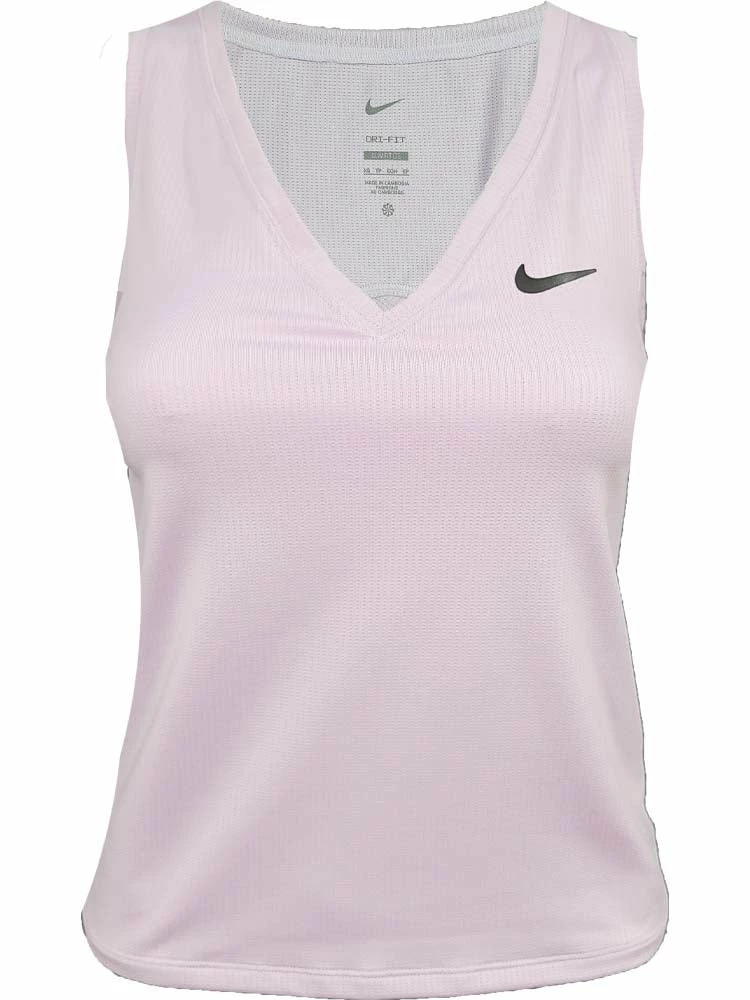 The NikeCourt Victory Tank is a soft, stretchy court essential that wicks sweat so you can stay focused on your match. Slim fit for a tailored feel. V-neck. Racerback. Fabric: 89% polyester/11% elastane. Color Shown: Doll / Black.