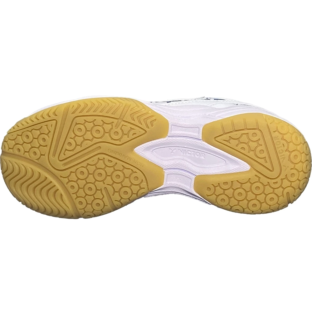 The Victor A170 AF features the new generation of high elasticity material, with a 22% increase in rebound ability, the shock absorbency increase by 6% which can dramatically enhance the instant resilience, shock absorption and cushioning effect to shocks. Highly resilient midsole material is more durable and retains its shape better. It not only provides the basic stability and shock absorption but also increases flexibility and increases the reaction time while changing directions. Colour Shown: White / Nautical Blue.