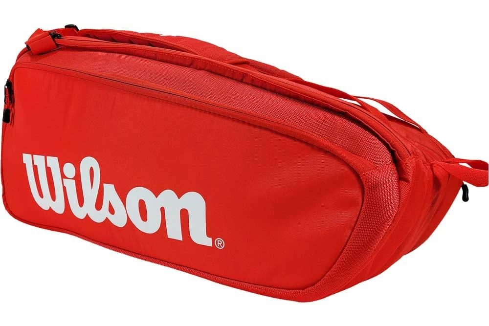 This Wilson Super Tour bag comprises three main compartments, two of which are lined with Thermoguard to protect contents from extreme heat. Additional features include a pair of large exterior side pockets, a ventilated shoe pocket, a dual carrying system and reinforced side panels that help prevent fabric from ripping at the seams. Colour Shown: Red.