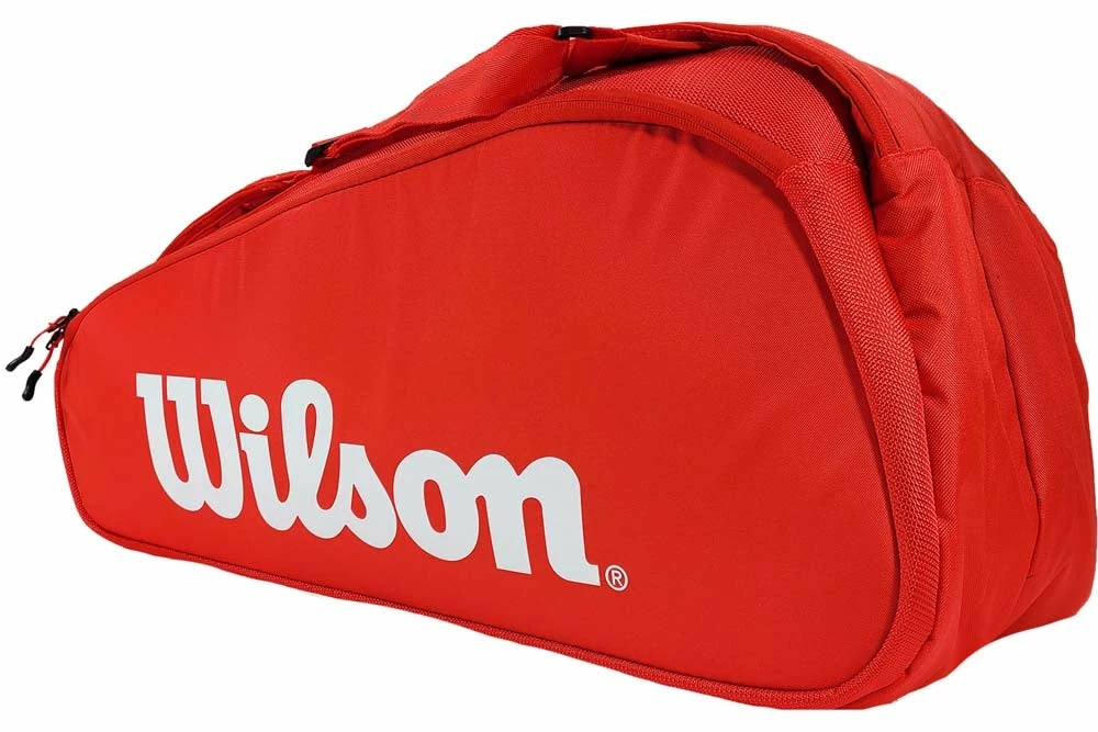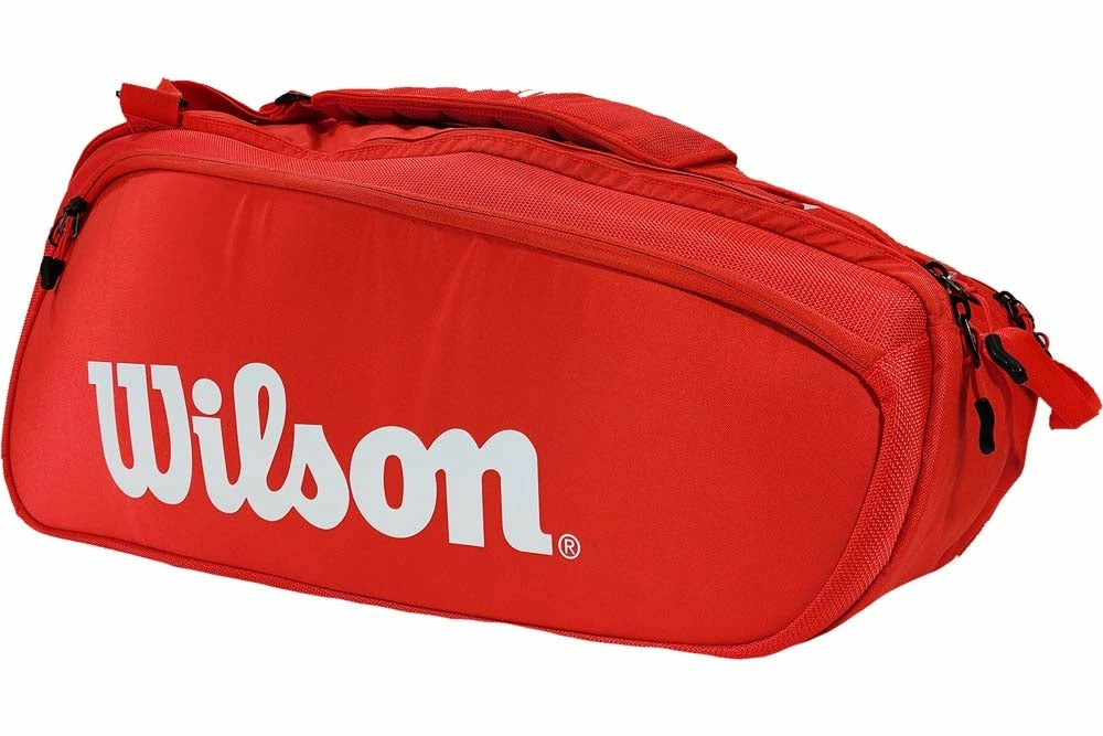 This Wilson Super Tour bag comprises three main compartments, two of which are lined with Thermoguard to protect contents from extreme heat. Additional features include a pair of large exterior side pockets, a ventilated shoe pocket, a dual carrying system and reinforced side panels that help prevent fabric from ripping at the seams. Colour Shown: Red.