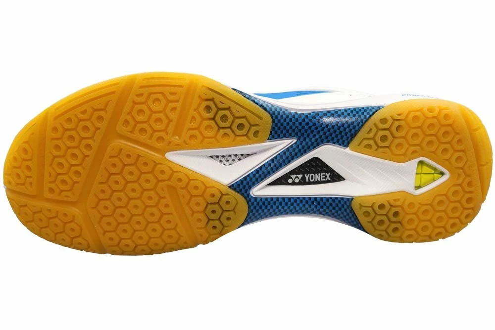 New POWER CUSHION 65 Z 2: The Shoe of Choice for the World’s Top Badminton Players. By adding a special elastic resin to POWER CUSHION, while maintaining the conventional lightweight properties, high shock absorption is realized. Grooves designed in a lattice pattern, with optimum spacing and depth, achieve further resilience. Compared with conventional cushining material, the new POWER CUSHION+ boasts 28% more shock absorption and 62% more repulsion. Also, a toe-centric design that cuts down on pressure in the big toe, as well as offering improved support at the mid-foot and heel for a stable fit. Power loss is reduced, allowing for swift footwork. The Lateral Shell located on the outside of the forefoot prevents sliding at the edge of the sole. It reduces power loss, increases footwork response and creates smooth, fluid and offensive foot movements. YONEX Synchro-Fit Insole construction creates a secure contact between foot and shoe, reducing energy wastage through an improved fit. A super-light graphite plate is inserted under the middle portion of the foot to increase stability and reduce weight within the shoe. The YONEX Round Sole is designed to provide all-around support for quick and smooth footwork. The Round Sole ensures smooth movements and transfer of maximum energy. For agile and stable footwork, the hexagrip pattern provides 3% more grip and is 20% lighter than standard sole material. Double Russel Mesh is an ultra fine mesh that is extremely lightweight and durable. It provides eight times more air-exchange for releasing moisture than ordinary mesh fabric. Colour Shown: Cobalt Blue.